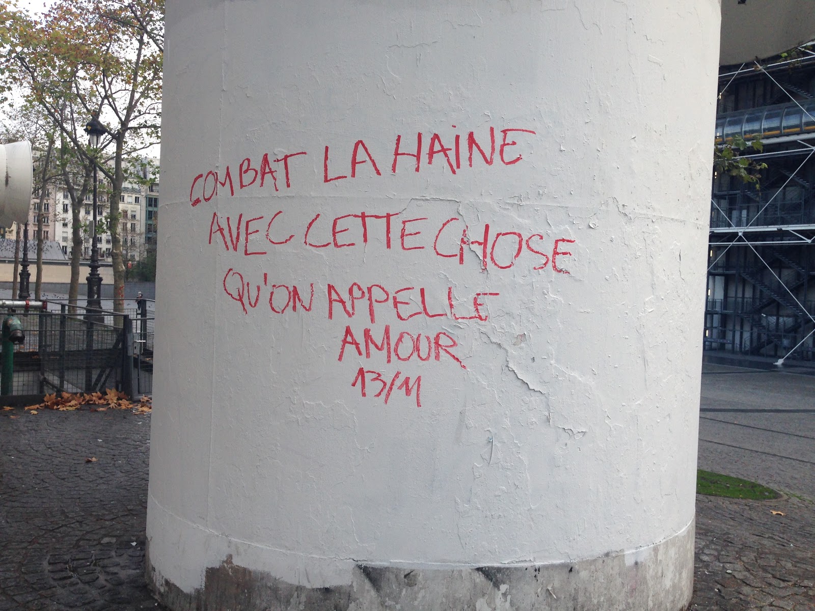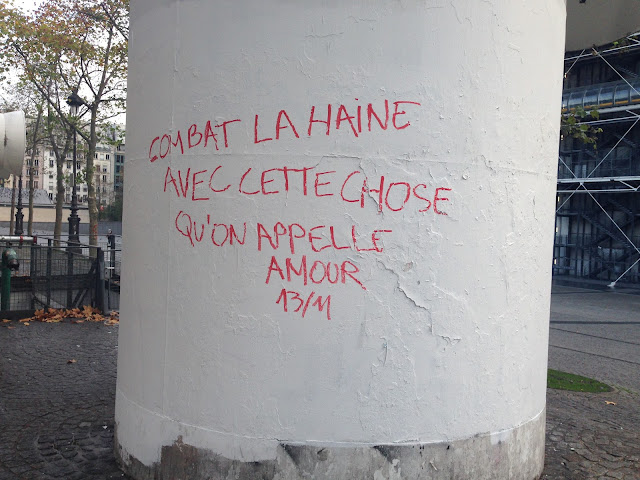 Friday night I had met some friends near the Centre Pompidou for drinks and dinner, and just as we were deciding on pizza or thai food a message came through about there having been attacks at the Stade de France. I didn't even know really that a football game was happening, so I thought it might just be soccer violence. The others whipped out their phones as well and as the news began getting progressively worse and the sirens of police vans increased we all decided to head home. Once there, I spent the rest of the evening with the couple I am staying at, all glued to the TV and watching as the death toll went steadily up. Friends kept messaging if everything was ok, that they'd just heard the news. When the death toll reached 80 people and the siege in the Bataclan was still ongoing, I decided to go to bed, that this could only get worse.